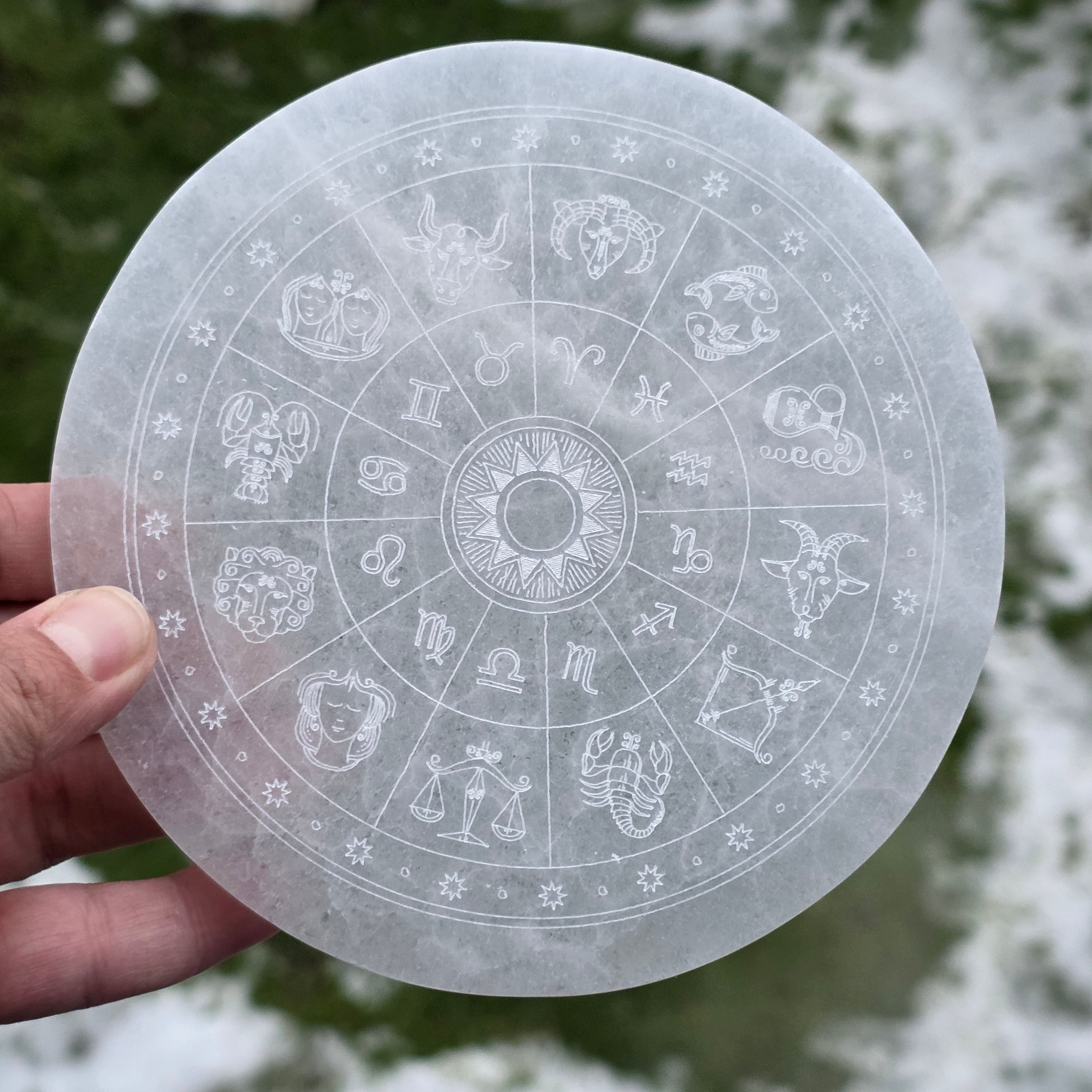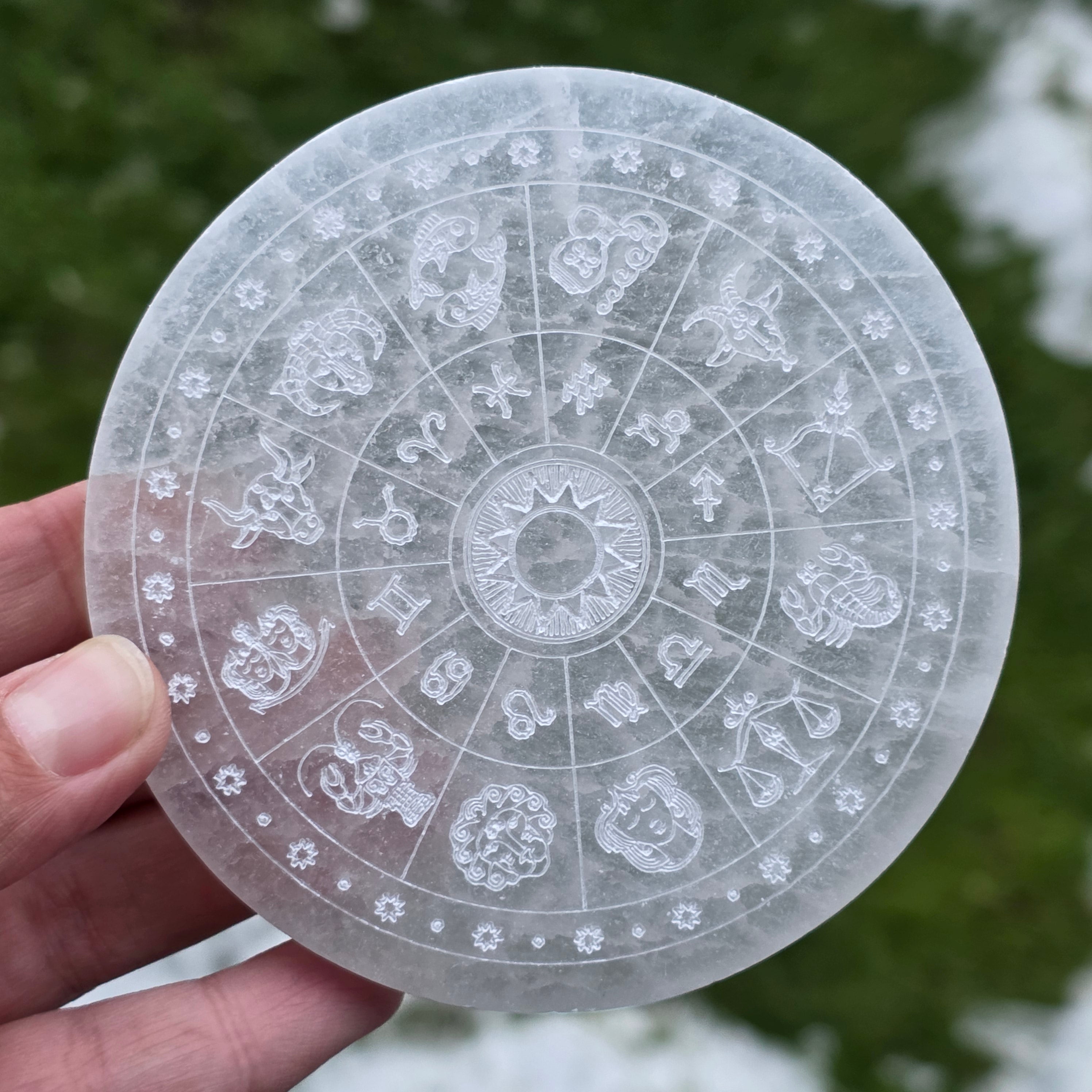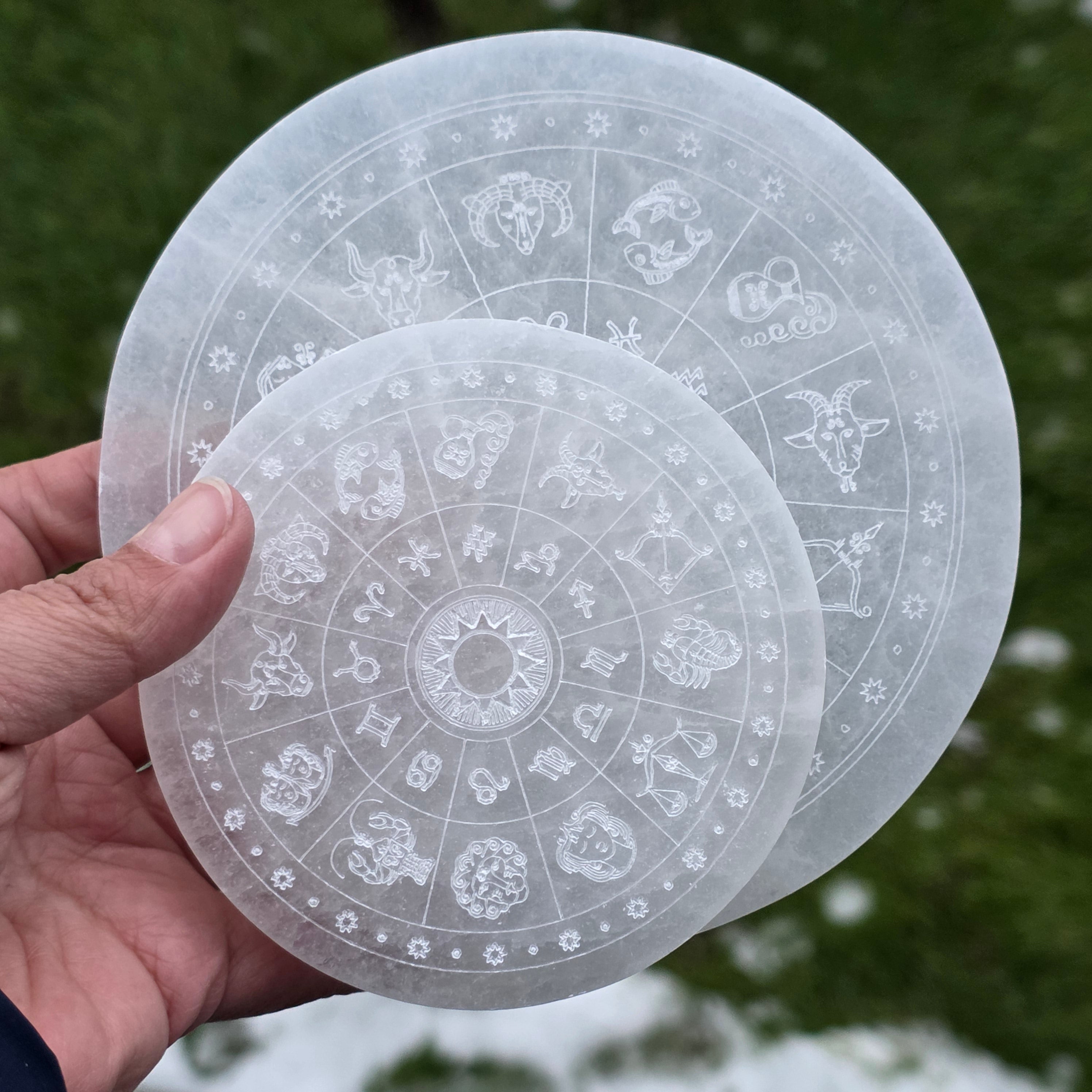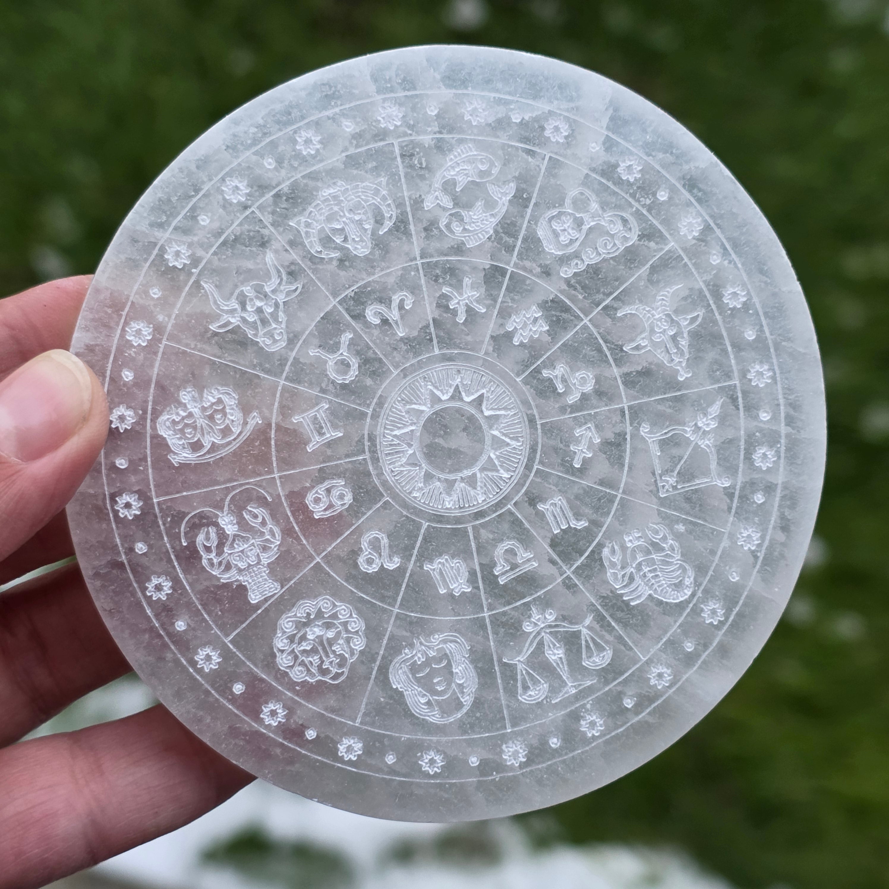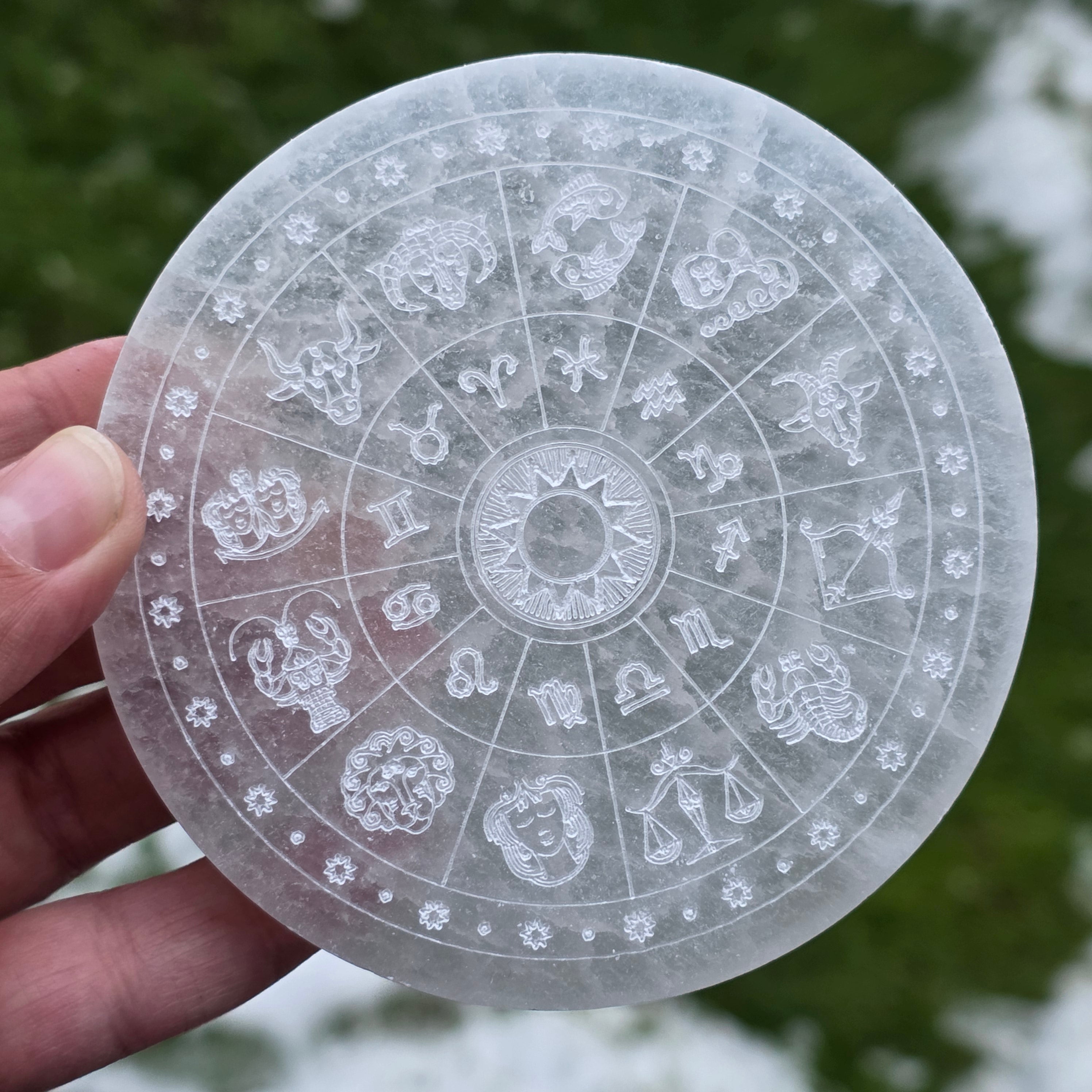 Choose this Selenite disk with zodiac symbols as a tool for purification and reconnection to the rhythms of the universe.